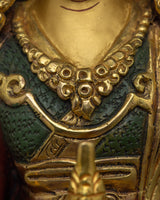 This Handcrafted Vajrayana Master Guru Rinpoche Decor Statue, also known as Padmasambhava, measures 9.3”/23.5cm in height and 5.9”/15cm at the base, weighing 1.39 kg. It reflects traditional craftsmanship and is made from a copper body adorned with 24K gold gilding, gold, and acrylic paintings. Expertly crafted by skilled Nepali artisans, it makes a refined addition to compact altars, meditation spaces, or personal spiritual collections.