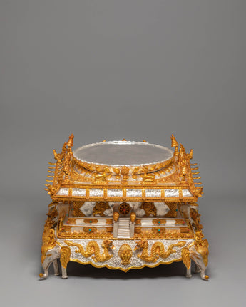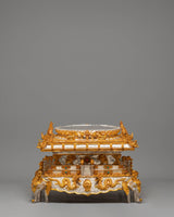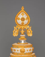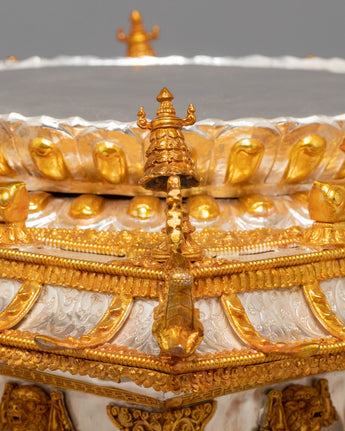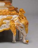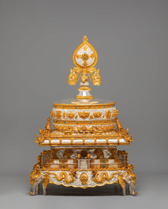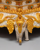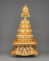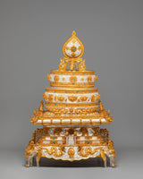This sacred mandala offering set represents a complete and reverent presentation, symbolizing harmony, balance, and the accumulation of merit through devotional practice. Its layered structure reflects the integration of spiritual intention and ritual offering, making it a meaningful centerpiece for ceremonial use. Placed in a shrine or temple setting, it serves as a visual focus for contemplation, generosity, and mindful offering, supporting an atmosphere of reverence and spiritual dedication.