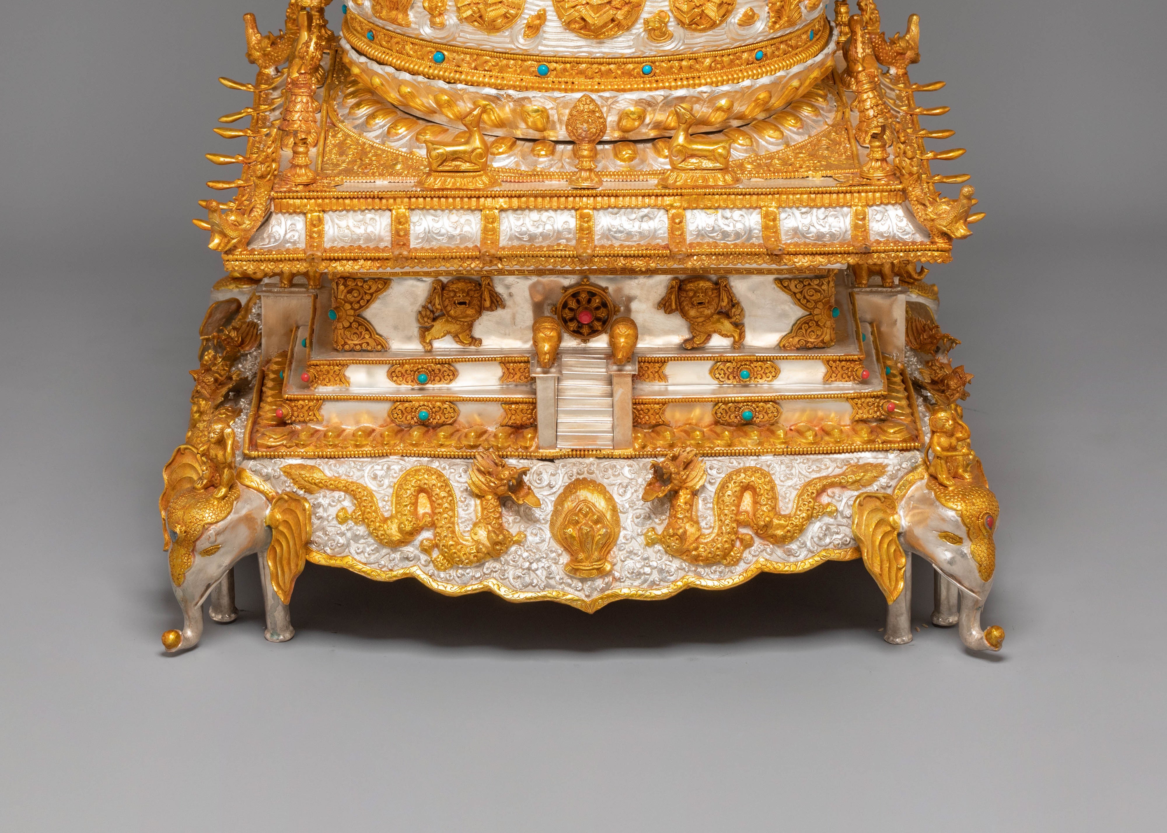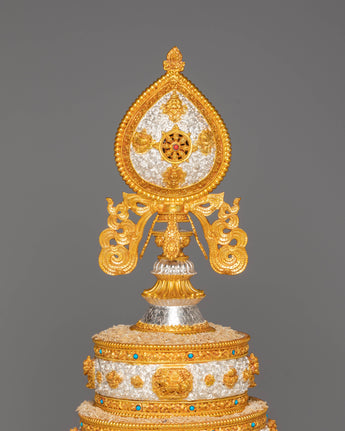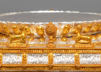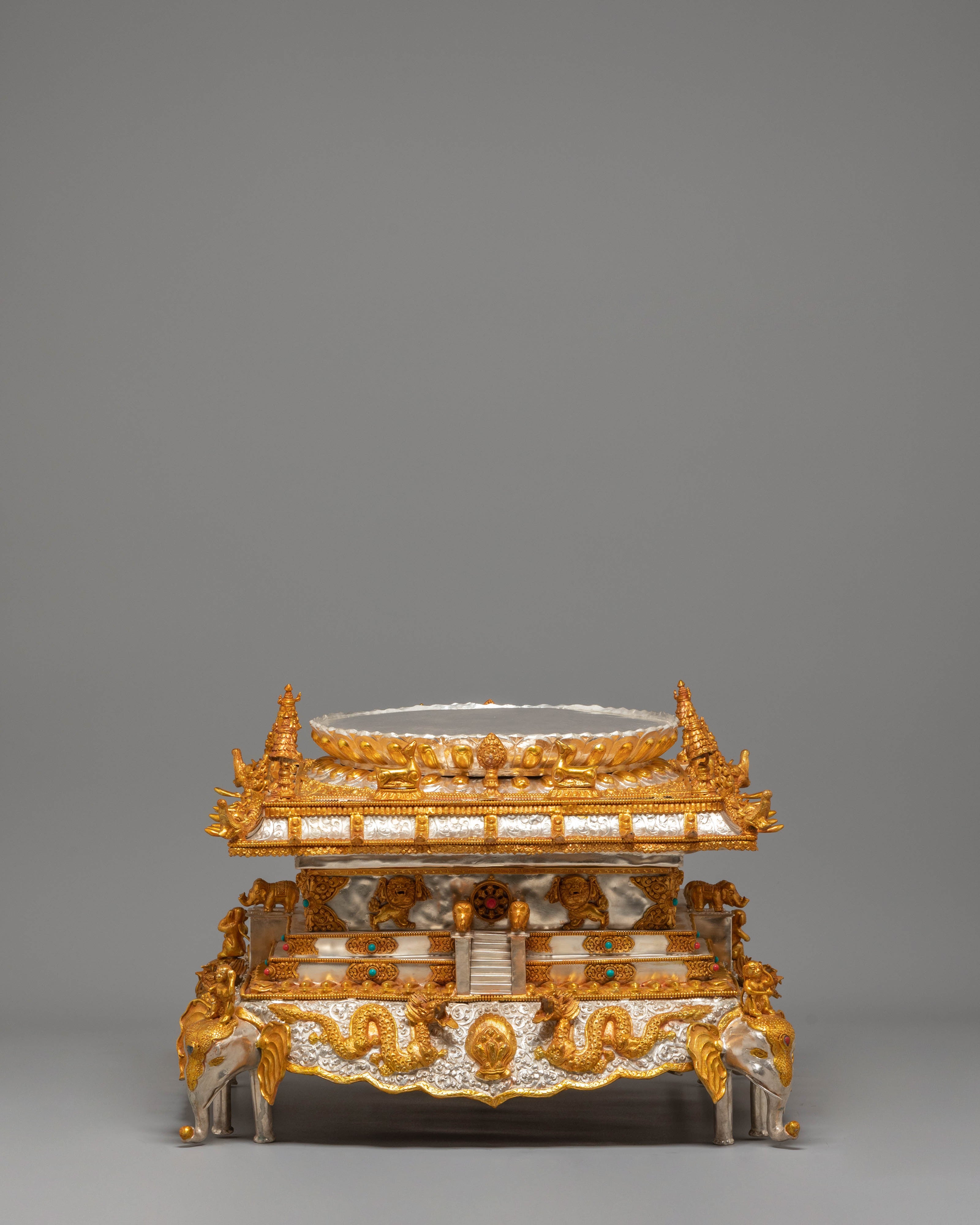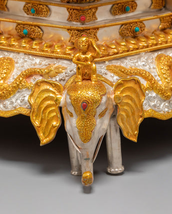 The mandala features a harmonious golden-and-silver mixed-color composition, creating a balanced visual contrast. At the top rests a finely detailed Dharma Wheel, while a kalasha beneath it supports the structure. The base is intricately carved with figures of lions, elephants, and dragons, executed with precise detailing that enhances the piece's overall architectural depth and visual strength.