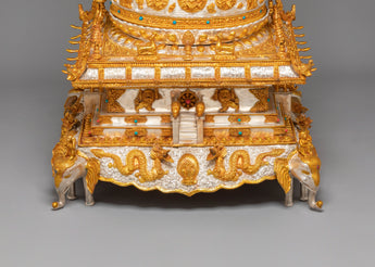 This Buddhist Sacred Mandala Offering Set stands at 108.5cm in height and 56cm in width, with a central mandala measuring 33cm, and weighs 23.71 kg. Crafted from a copper body, the piece is finished with electro-gold and electro-silver plating, enriched with turquoise and coral gemstones, giving it a dignified, ceremonial presence suitable for temples, shrines, and sacred display spaces.