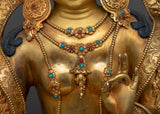 The Graceful Tara Gold Gilded Statue, standing gently at 21.5 inches, radiates a tranquil aura of compassion and beauty. This beautiful statue is carefully handcrafted of copper, brilliantly gilded in 24K gold, and complemented with finely detailed paintwork in both gold and acrylic. Tara represents compassion, protection, and wisdom in Tibetan Buddhism, which makes this statue a valuable addition to any hallowed area.