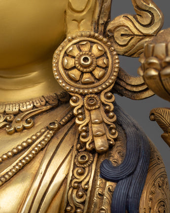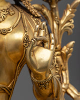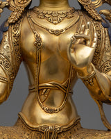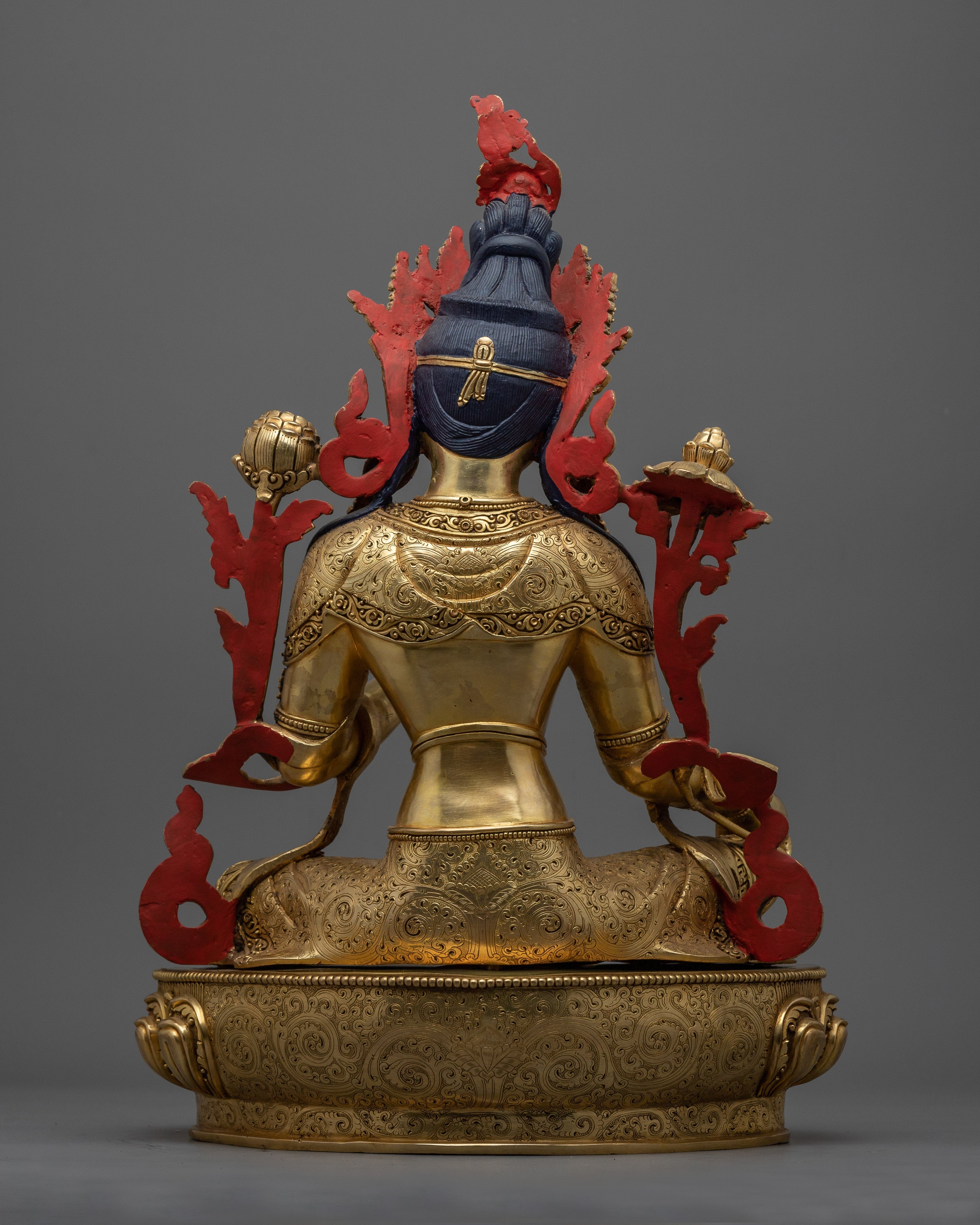 With the Green Syama Tara Statue, embody the divine feminine spirit of compassion and enlightenment. This sculpture, an excellent work of art and craftsmanship, exudes Green Tara's spiritual presence. With a height of 18.3 inches and a base diameter of 12.6 inches, it radiates inner brilliance and grace. Complete with elaborate acrylic paintings and 24K gold gilding on a copper body, this statue perfectly embodies the profound teachings of Green Tara.