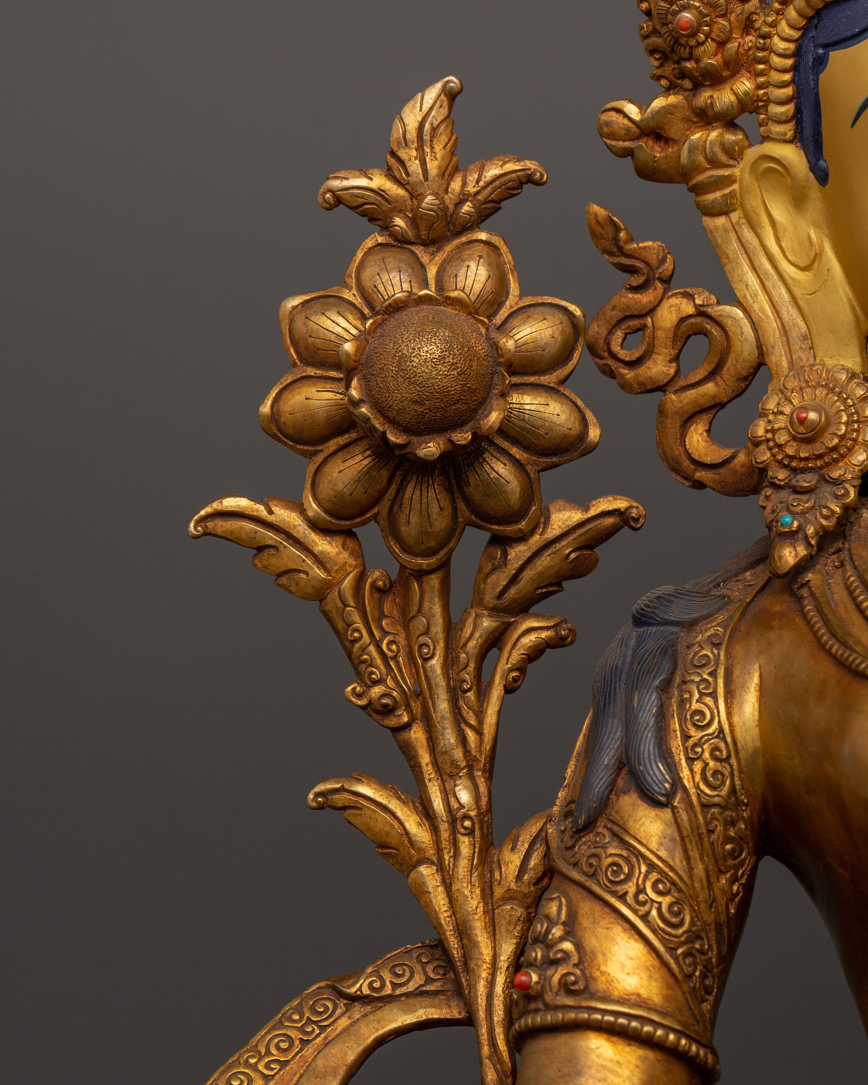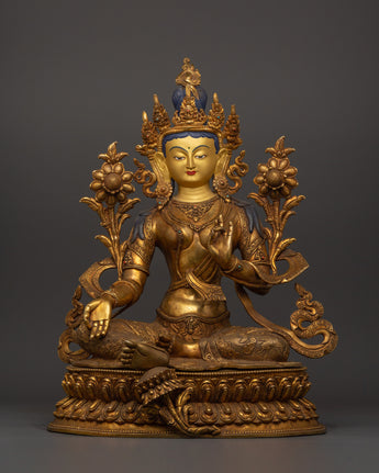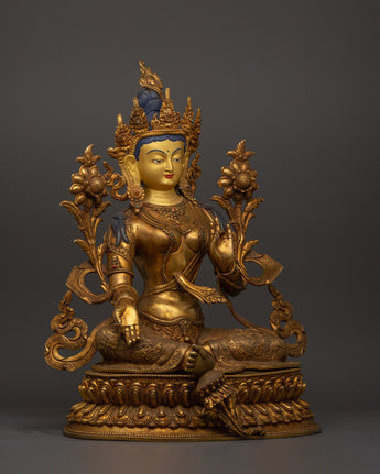 The statue's intricate features capture Green Tara's dynamic energy and loving personality. Her beautiful, contemplative posture is matched by energetic hand motions indicating her willingness to assist. This statue is a strong instrument for meditation, healing, and spiritual growth, making it an excellent focal point for any sacred place.