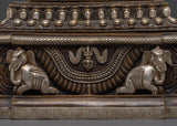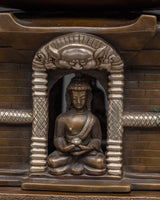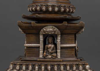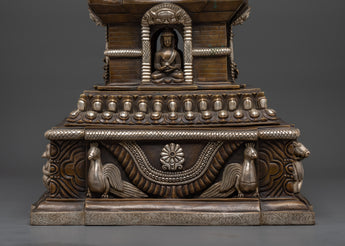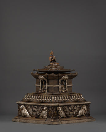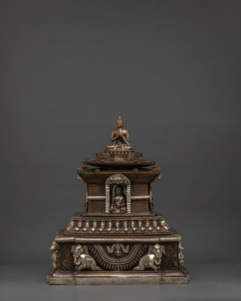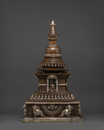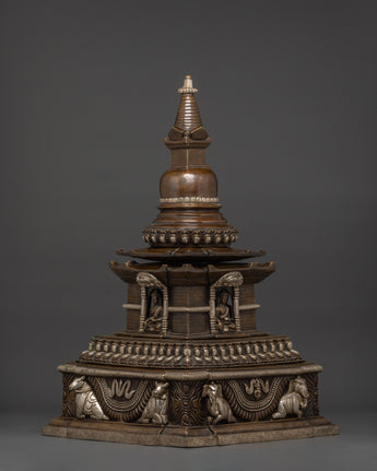The design of this Oxidized Copper Stupa features intricate carvings and motifs that represent key elements of Tibetan Buddhism. The stupa is crowned with a prominent spire, symbolizing enlightenment and the path to spiritual awakening. At the center of the structure, a seated Buddha statue is housed, embodying the teachings of compassion, wisdom, and peace. The elephant carvings on the base further emphasize the stupa's connection to spiritual strength and protection, as elephants are revered as symbols of mental clarity and mindfulness in Buddhist teachings.