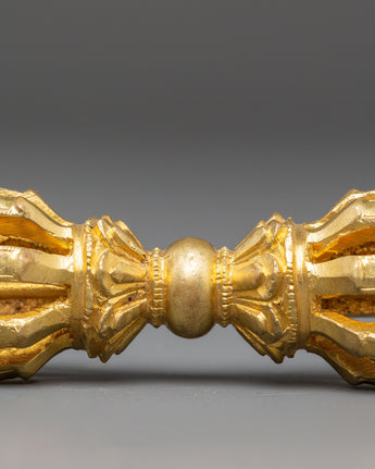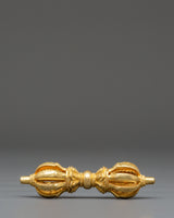 The brass and bronze craftsmanship of this sacred set exemplifies great traditional creativity. The bell is delicately etched with auspicious designs and features a dorje handle, while the vajra's polished golden finish enhances its sacred glow. Each detail, from the carved god faces to the symmetrical prongs of the vajra, holds profound meaning rooted in Vajrayana meditation. This set, whether used in ceremonies, meditation, or on an altar, promotes spiritual balance and inner awareness.