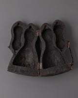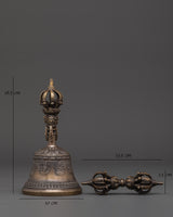 Crafted by skilled Nepalese artisans, this set is made from brass, copper, and white metal, boasting a visually appealing design. The bell measures 18.5cm in height with a 10cm base, producing a clear and resonant tone to aid meditative focus. The vajra, 13.5cm in length and 3.5cm in height, is intricately detailed for ritual use. The cover, at 22.5cm high and 15cm at the base, fits perfectly for secure storage. With a total weight of 1.26kg, it is substantial yet easy to handle, making it ideal for practitioners, temples, and collectors of sacred instruments.