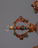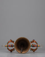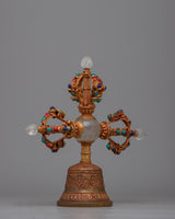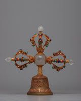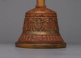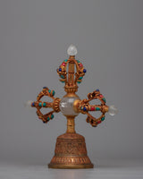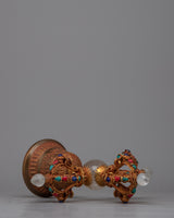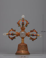 Presenting the Double-Vajra handled Bell, a beautiful fusion of spiritual symbolism and fine craftsmanship. This ceremonial bell is handcrafted with original stones such as turquoise, coral, lapis lazuli, and crystal. It is made up of copper and bronze. It weighs 0.804 kg and measures 26 cm in height and 26 cm in breadth.