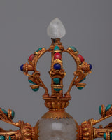 Combining the bell and the vajra (thunderbolt) in Tibetan Buddhist rituals is an essential symbol of compassion and knowledge. Its elaborate design, embellished with precious stones, produces both its aesthetic appeal and ceremonial significance. Lapis lazuli for spiritual insight, crystal for clarity, coral for vitality, and turquoise for protection all contribute layers of symbolism and color to the piece.