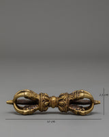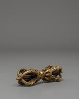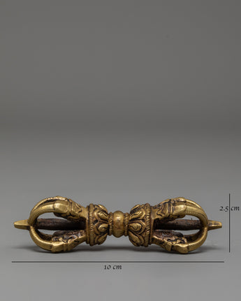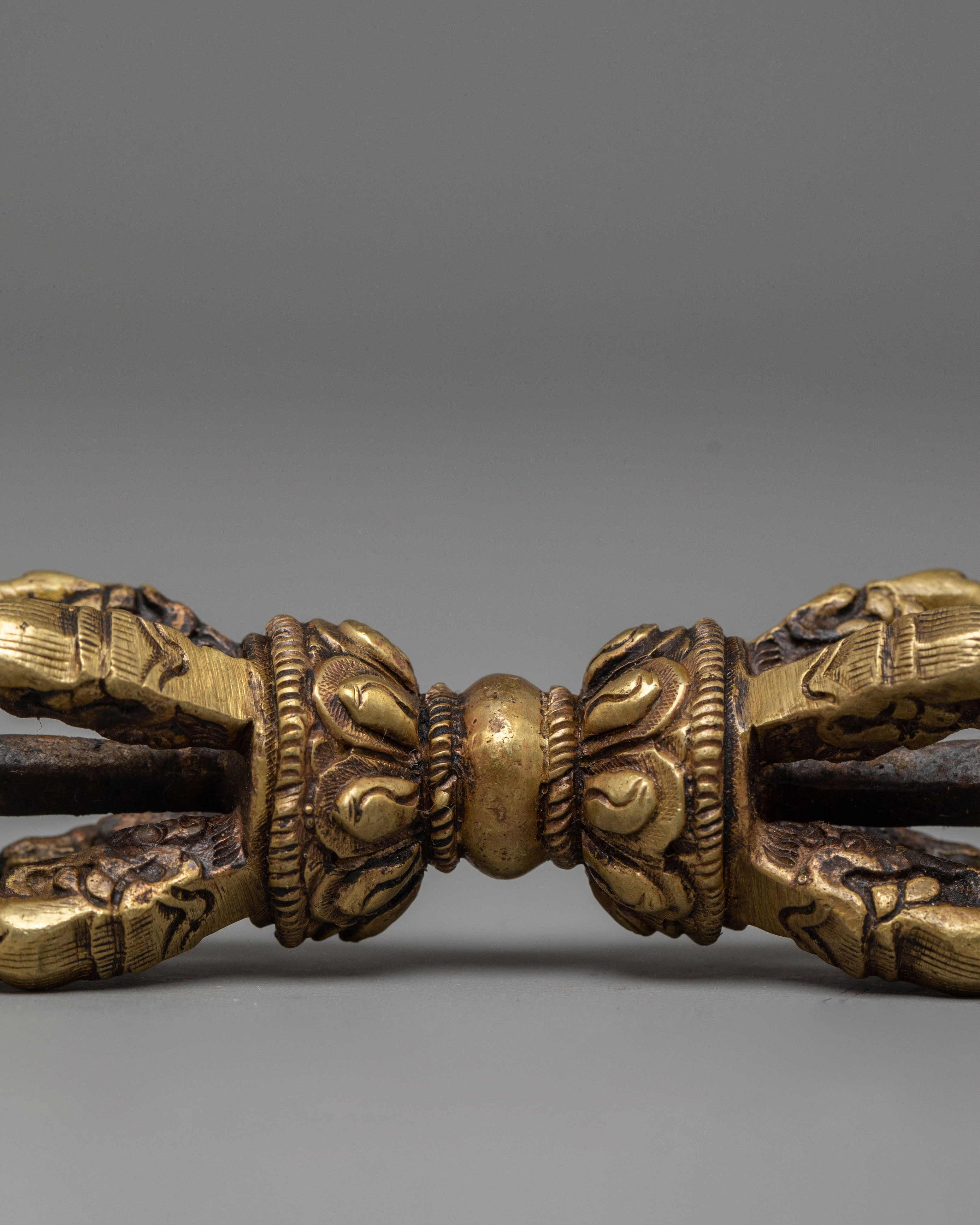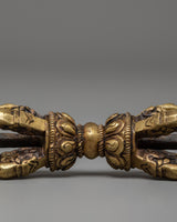The Vajra includes elaborate carvings that reflect its five-pronged form, which represents the five transcendental Buddhas, each embodying an attribute of the enlightened mind: compassion, wisdom, serenity, awareness, and power. The symmetrical design connects two lotus bases in the center, representing the combination of technique and knowledge, or compassion and insight—the core of Buddhist practice. Its golden brass surface radiates a timeless aura, representing both the creative virtuosity of Himalayan metallurgy and the significance of its religious function.