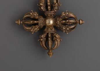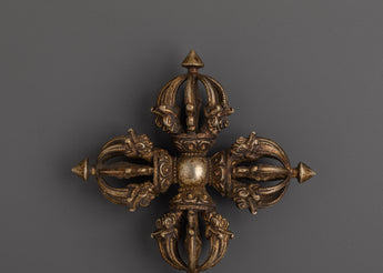 The Handmade Vishwo Vajra Chakra tool is a sacred artifact, made from copper and finished with a gold plating. Measuring 13 cm in height and weighing 0.33 kg, it represents a powerful blend of resilience and spiritual significance. Integral to tantric ceremonies, this Vajra symbolizes the harmony of wisdom and compassion, providing protection and healing to those who embrace it in their spiritual journey.