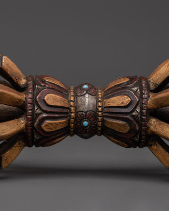 The route to enlightenment and the unbreakable nature of truth are symbolized by this Powerful Iron Vajra (dorje). Any ceremony or Vajrayana practice is made more energetic by the sacred symbols painted throughout its surface, which stand for wisdom, protection, and cosmic balance. The iron construction provides grounding energy, while the colorful ornamentation adds spiritual and cultural depth. This piece, which combines with sacred design, is perfect for use in sophisticated ceremonial work or as the focal point of spiritual presentations. This vajra, adorned with holy symbols, resonates with strength and spiritual understanding, making it ideal for Buddhist practitioners, collectors of sacred ritual instruments, and those committed to energy alignment and meditation.