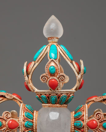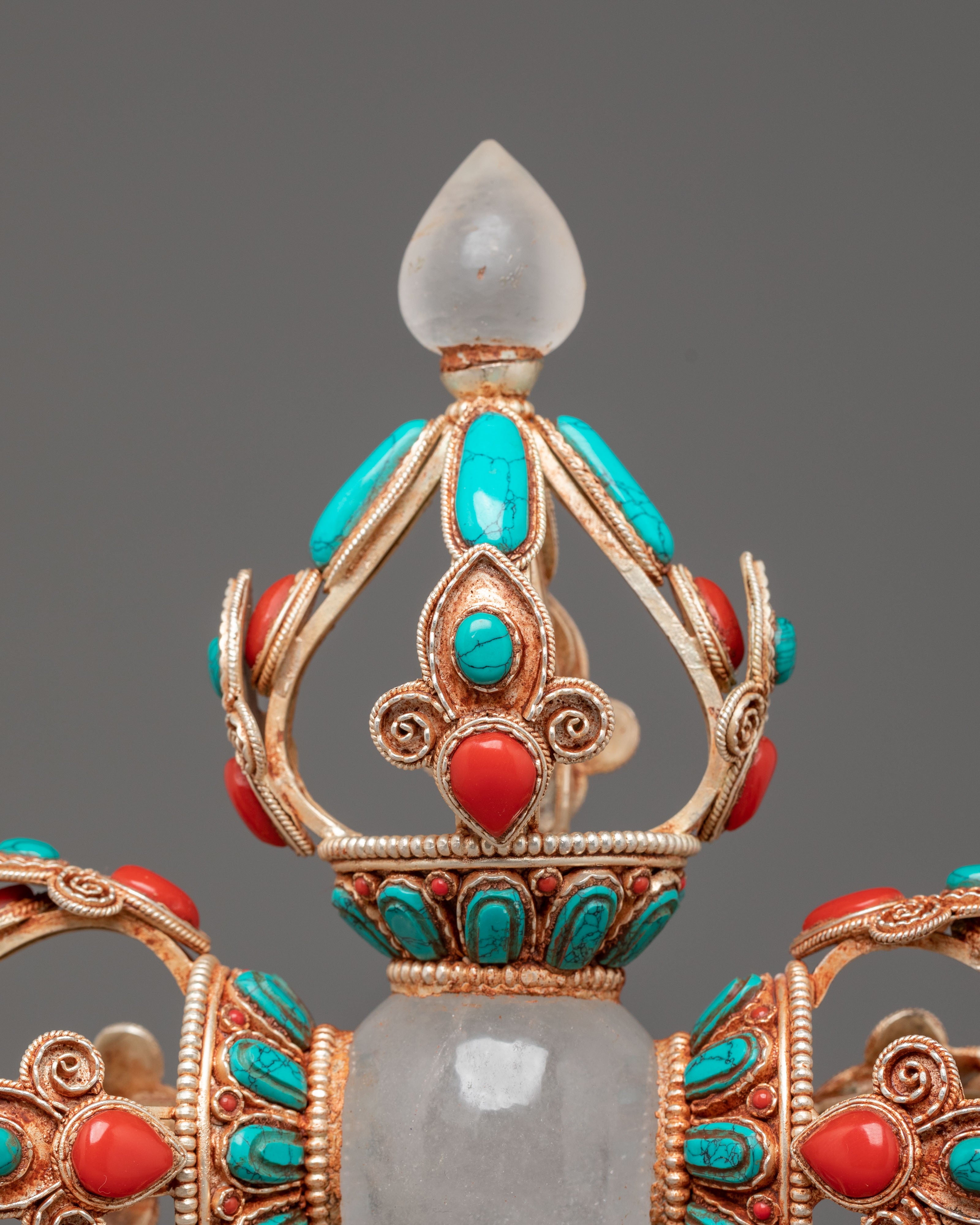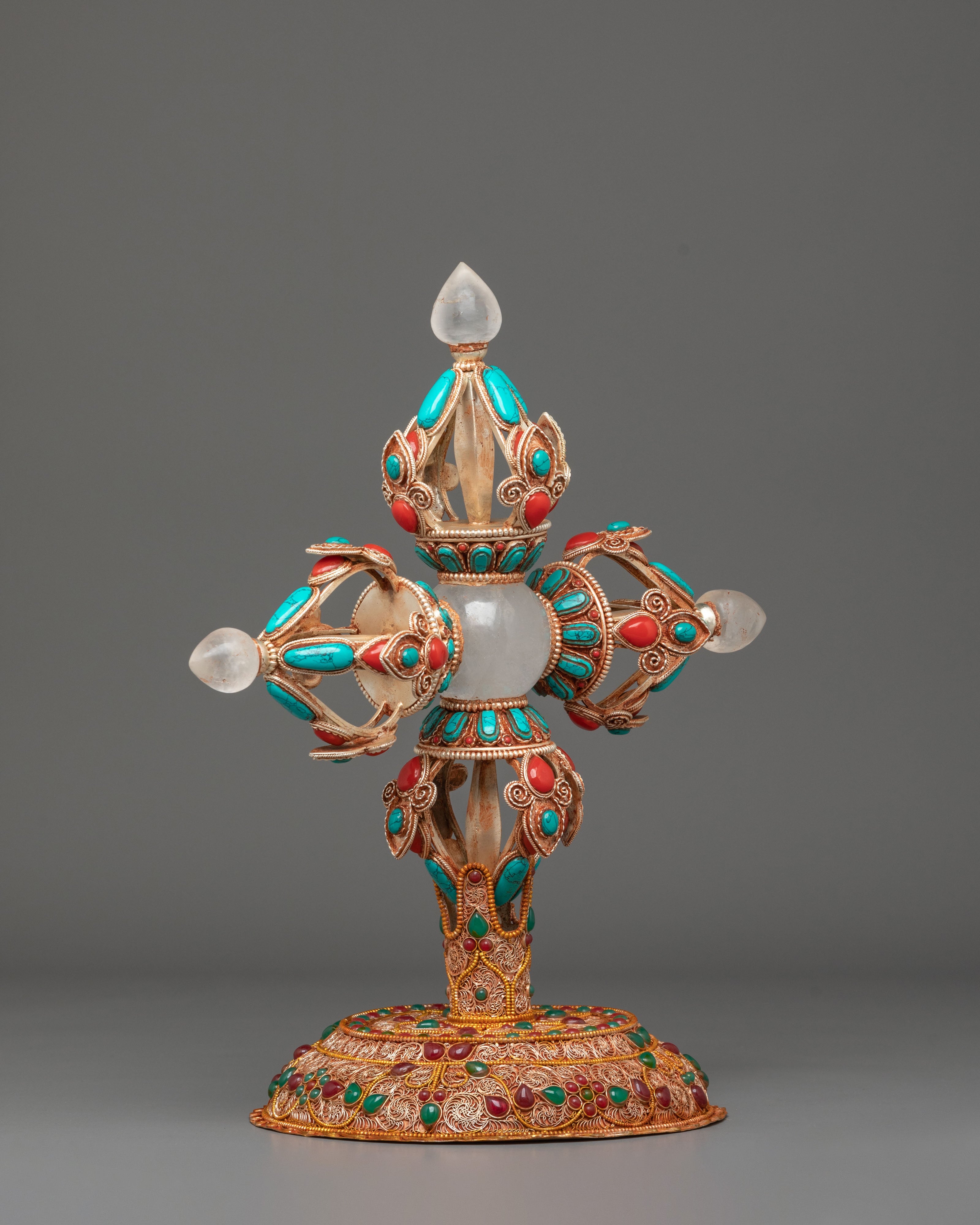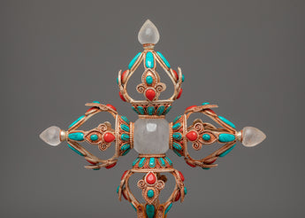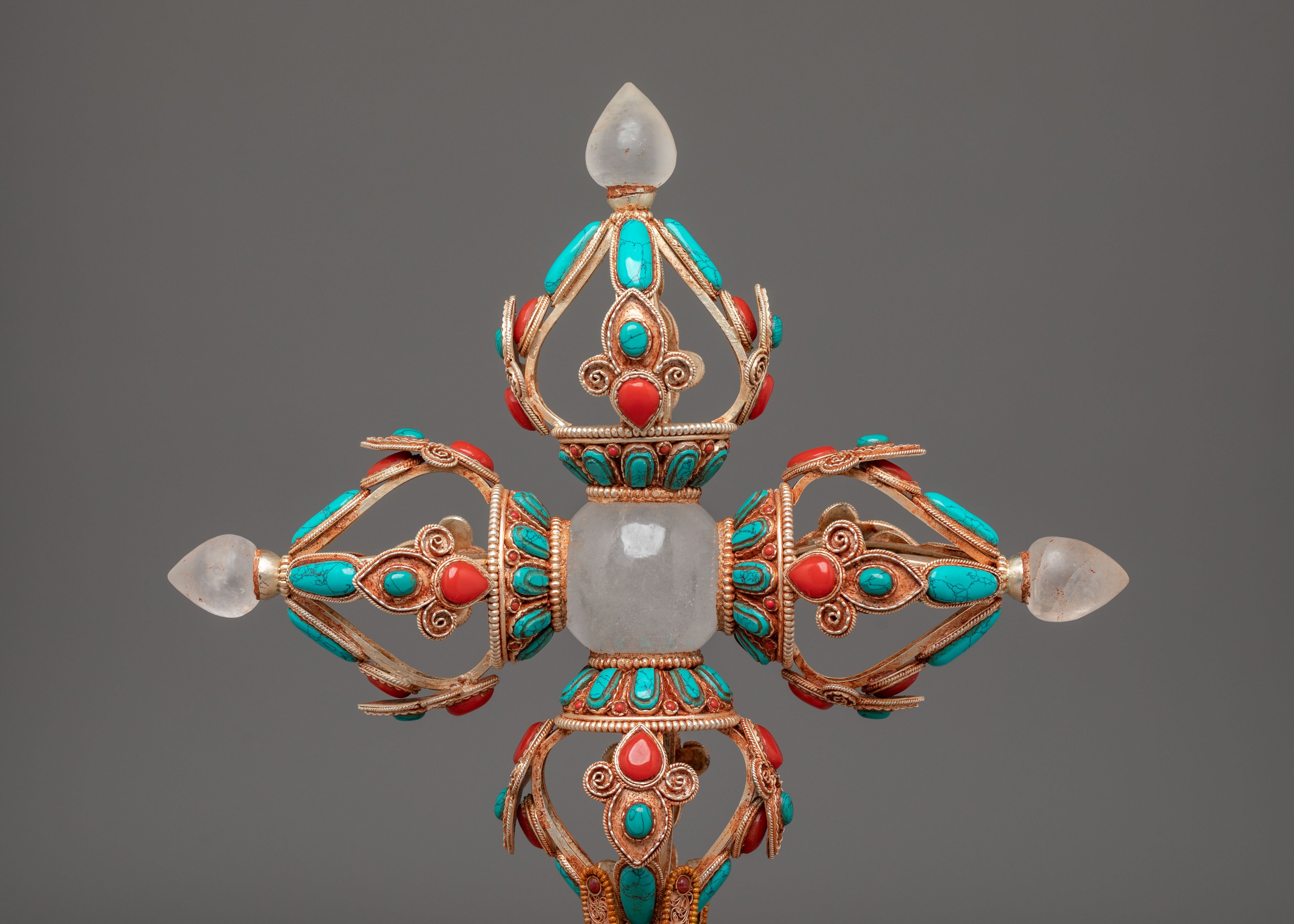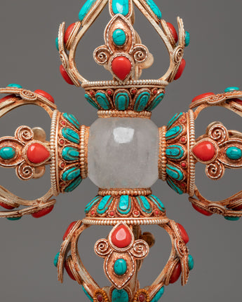 This Tibetan Buddhist Vishva Vajra (double vajra) is a powerful symbol of Vajrayana Buddhism, embodying stability, universal protection, and the foundation of enlightenment. Also known as the crossed or four-directional vajra, it features four vajra scepters radiating from a central sphere, pointing toward the cardinal directions to represent the omnipresent wisdom of Buddhism. The intricate gilt copper construction showcases masterful Himalayan metalwork, with vibrant turquoise and coral cabochon stones set within elaborate bezels. Crystal quartz points at each terminal symbolize the clarity and indestructibility of diamond-like consciousness.