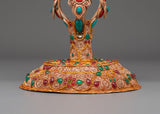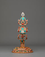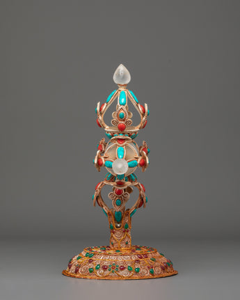 The elaborate dome-shaped base of this Vishva Vajra is equally impressive, crafted from detailed copper filigree work and adorned with turquoise and coral stones. It symbolizes Mount Meru, the cosmic center of Buddhist cosmology, while the vajra arms represent the spread of Buddhist teachings. The decorative motifs, including mythical makara and cloud scrolls, enhance the ritual object's deep spiritual significance. The entire piece embodies the five wisdoms of the Buddha families, with the central sphere symbolizing the dharmakaya (truth body).