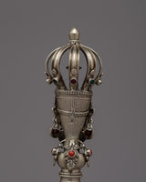 This set is more than just a pretty piece of decor; it's a significant item that represents fine craftsmanship and deep spiritual values. Each piece is made to be both attractive and useful thanks to the elaborate designs and exquisite details that are a reflection of traditional Tibetan skills. Crafted with great care to capture their symbolic meaning, the bronze bell and silver vajra offer spiritual enrichment as well as artistic perfection. The Tibetan Vajra and Bell Set is a priceless addition to any collection or hallowed space and a monument to the rich artistic and spiritual legacy of Tibetan Buddhism.