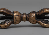 The Vajra represents the unbreakable root of enlightenment and spiritual power. At the same time, the sound of the bell, which has resonating tones, is said to signify an absence and clarity of mind. This set's handcrafted brass craftsmanship gives it a charming vintage experience, enhancing any sacred place or collection and serving as a useful tool for rituals. Elevate your meditations with these ageless symbols of strength and wisdom by recognizing the Tibetan Vajra and Bell set's significant spiritual tradition and exquisite craftsmanship.