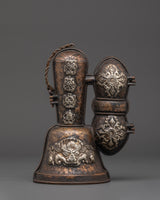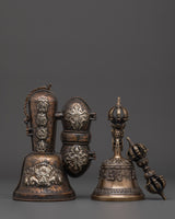 The entire set is crafted from a combination of copper, brass, and white metal, giving it a metallic sheen. The artistic metalwork highlights the cultural and spiritual significance of these ritual objects, often used in meditation and ceremonies. The craftsmanship reflects traditional Tibetan art and symbolism.