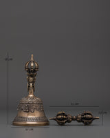 Expertly handcrafted by skilled artisans, the set is made from copper, brass, and white metal, each chosen for its beauty. The bell measures 18cm in height with a 10cm base, producing a clear, resonant tone for meditative focus. The vajra is 13cm in length and 3.5cm in height, intricately detailed for a comfortable grip. The cover, at 20.5cm high and 16cm at the base, provides a perfect fit for secure storage. With a total weight of 1.21kg, this set is substantial yet easy to handle, making it ideal for practitioners, temples, and collectors of sacred art.