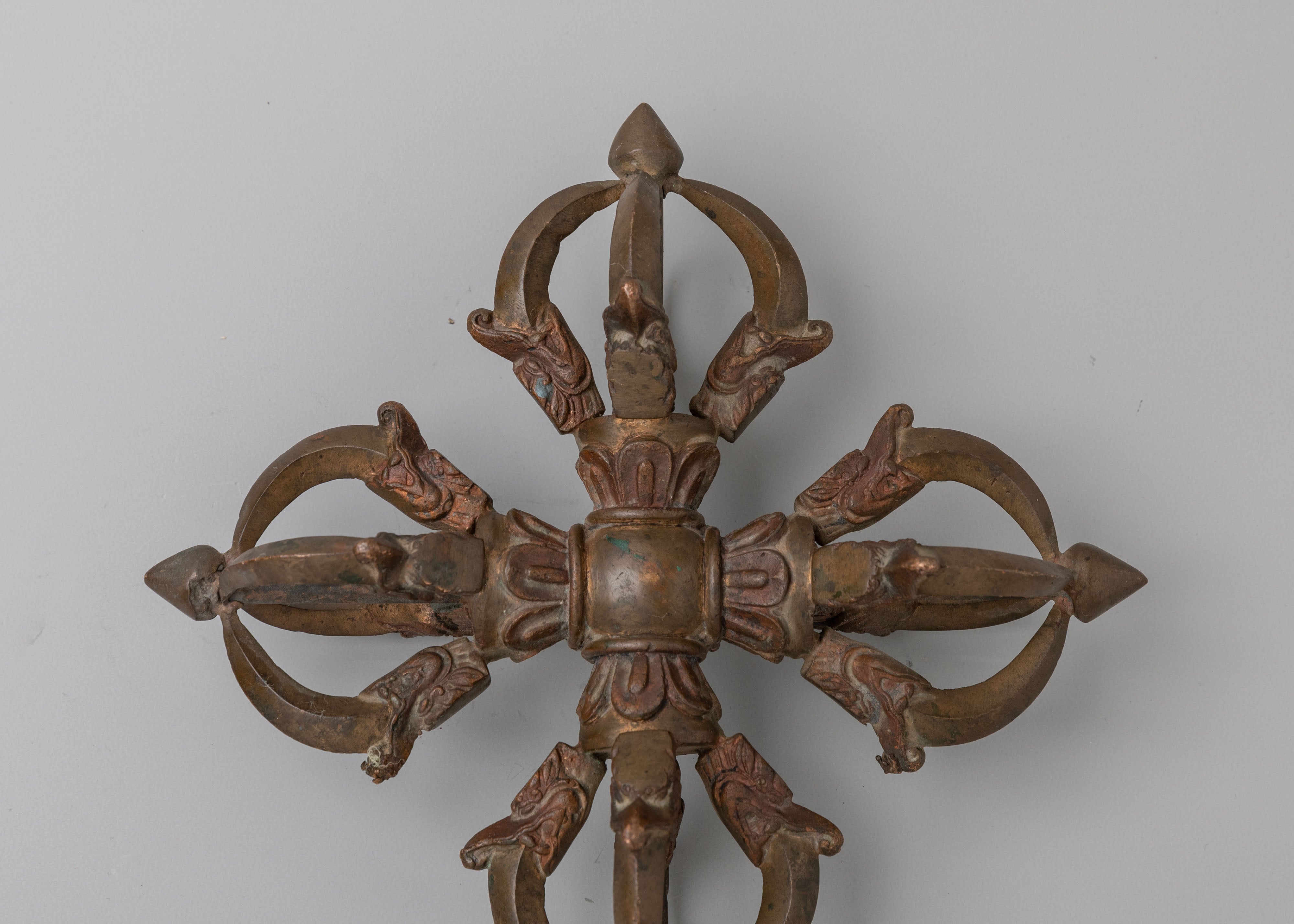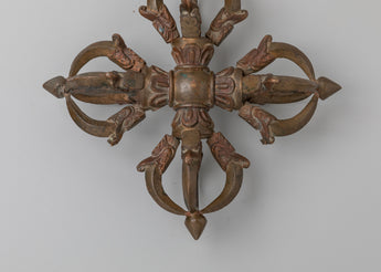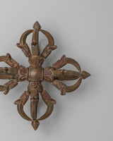 The Vishwo Vajra features four prongs that extend from the central body, each one representing a different aspect of Buddhist wisdom and protection. These prongs symbolize the four immeasurable qualities—love, compassion, sympathetic joy, and equanimity. The central body of the Vajra signifies the union of wisdom and compassion. This finely detailed design speaks to the interconnectedness of all things in Buddhist philosophy. The copper finish and artisanal craftsmanship enhance its sacred nature, making it an ideal item for those seeking to deepen their spiritual practice or display a meaningful spiritual symbol in their home.