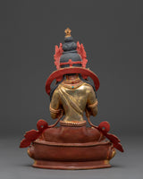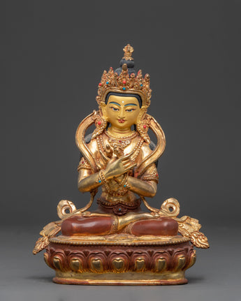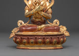 The Enlightened Deity Vajradhara Artwork symbolizes the essence of the enlightened mind and ultimate wisdom in Tibetan Buddhism. This statue is crafted from copper, featuring 24K gold gilding and set with gemstones. This statue measures 8.7”/22cm (Height) x 6.9”/17.5cm (Base). Designed by talented Nepalese artisans, this detailed sculpture is ideal for altars, meditation areas, or as a meaningful decorative item for individuals seeking to cultivate awareness in their daily lives.