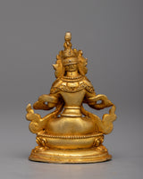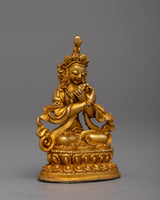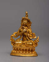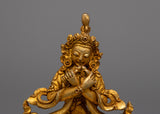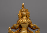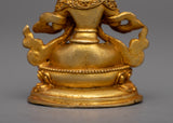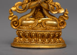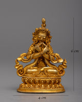 Presenting the exquisitely constructed Vajradhara Statue, which is plated in 24k gold and is made of copper. At 6 centimeters tall, this statue exquisitely portrays Vajradhara, the primordial Buddha and Dharmakaya's incarnation, signifying the pinnacle of Buddhahood. The piece has a brilliant elegance due to the gold plating, which accentuates the fine details of his meditation attitude and symbolic adornments.