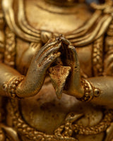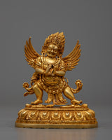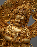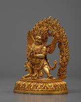 The Machine Made 11.5-cm-tall VajraKilaya Statue represents the ferocious and angry side of Vajrayana Buddhism. With its exquisitely crafted copper body and brilliant 24k gold plating, this statue radiates strength. The exquisitely detailed depiction of VajraKilaya, a symbol of spiritual protection and purification, communicates the deity's might in banishing evil spirits and impediments.