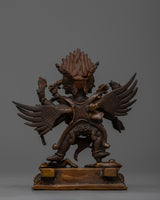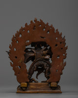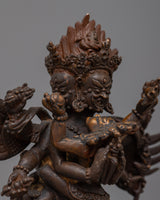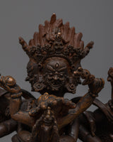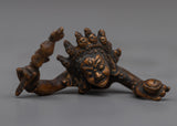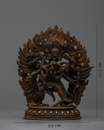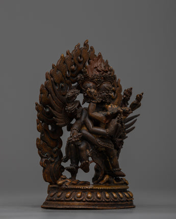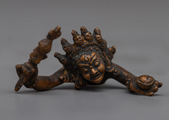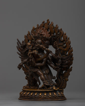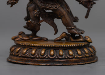 Explore the exquisitely created Vajrakilaya Consort Statue, which has an oxidized copper body. This 12.5-cm-tall figure is the consort of Vajrakilaya, a significant character in Tibetan Buddhism who is associated with protection and cleansing rites. The statue's intricate carvings are enhanced by the oxidized copper, which also gives it an old, cherished appearance that heightens its ethereal appeal.