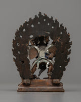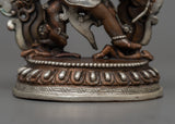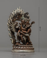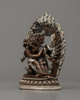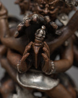 A modern interpretation of the venerated a deity in Tibetan Buddhism, the Vajrakilaya Machine Made Statue is expertly made on an oxidized copper body and completed with silver plating. This Machine made symbolizes the powerful and protective spirit of Vajrakilaya, signifying the ability to overcome adversity and chase away bad vibes. The statue is a powerful reminder of the transformational power and spiritual significance of the deity, with its exquisite workmanship and bright silver sheen.