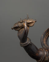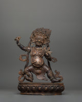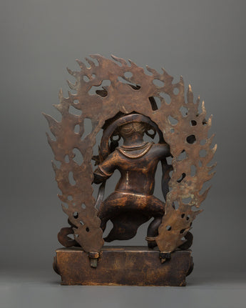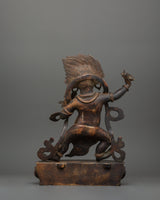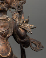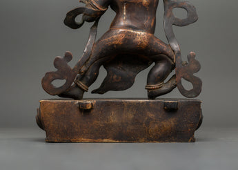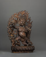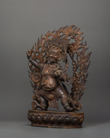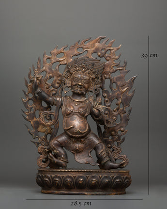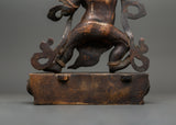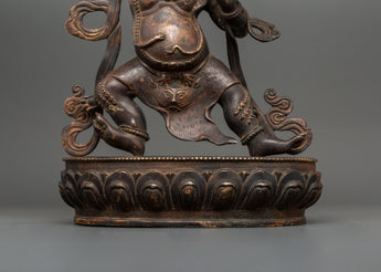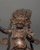 This 4.71kg Vajrapani statue, expertly carved from oxidized copper, features detailed workmanship highlighting the deity's dynamic posture, expressive face, and the mighty Vajra weapon, representing indestructible wisdom and enlightenment. The oxidized finish adds to its archaic, holy appeal, making it an excellent centerpiece for a shrine, altar, or meditation place. This substantial sculpture provides a steady stream of spiritual strength, courage, and heavenly energy.