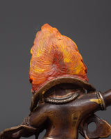 Vajrapani is an embodiment of indestructible power and compassionate wrath, depicted with several powerful symbols. In his right hand, he holds a vajra, symbolizing indestructible energy and the transformational power of enlightened compassion. His left hand holds a lasso, which is used to tie and control dangerous forces. A five-skull crown crowns his head, representing the transformation of the five poisons (desire, anger, ignorance, envy, and pride) into the five wisdoms. A vajra sits atop his head, symbolizing Vajrapani's spiritual might. He stands atop a bright sun disk base, signifying the brilliance of awakened consciousness, making this statue more than simply a work of beauty but also a potent talisman for spiritual transformation.