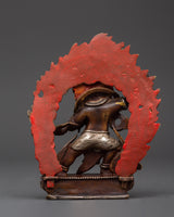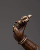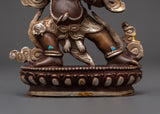 This meticulously carved Vajrapani Statue is 15.5 cm tall and weighs 0.74 kg, making it an excellent addition to any altar or spiritual area. The statue, skillfully created by Himalayan artists, has an amazing oxidized copper body with silver plating, accented with turquoise and coral. Vajrapani is shown in a dynamic dance pose, representing the active destruction of obstacles and the fierce force necessary to conquer ignorance. His serious look and muscular stance reflect the strength and commitment required to destroy any obstacles on the spiritual path.