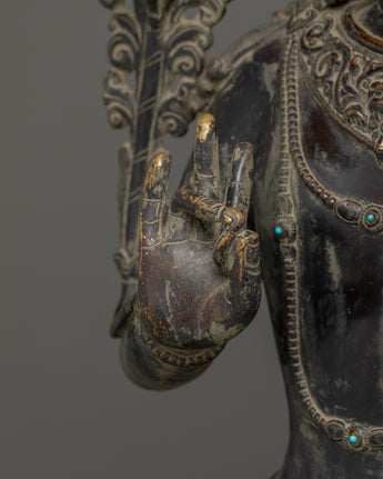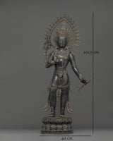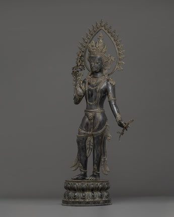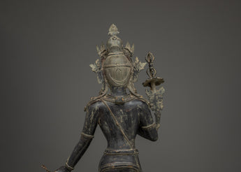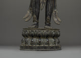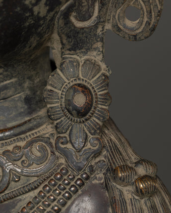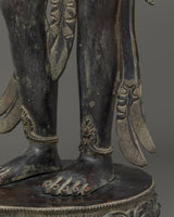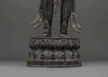 This Oxidized Copper Standing Vajrapani Statue represents the embodiment of spiritual strength and protection within Buddhist tradition. Standing majestically at 101.5 cm, this striking figure portrays Vajrapani—the Protector of the Buddha and the manifestation of all enlightened power. His fierce expression, dynamic posture, and powerful stance signify the conquering of ignorance and fear, reminding practitioners of the unwavering strength of wisdom. Crafted from an oxidized copper body, the statue exudes an ancient, dignified presence that enriches any altar, monastery, or meditation space.
