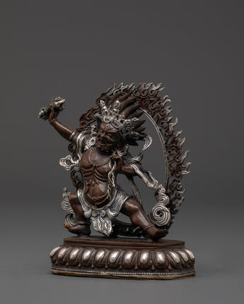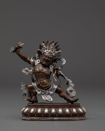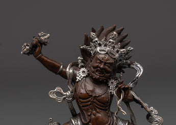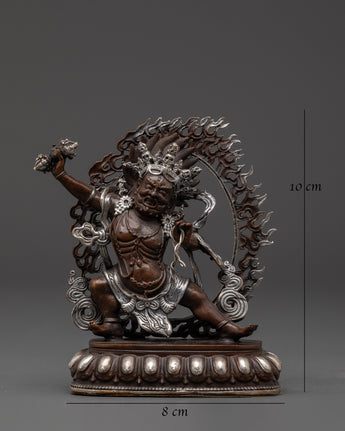 This fierce Vajrapani Bodhisattva Statue, which represents the guardian of Buddhist teachings, invokes power and ferocious compassion. Crafted from copper and expertly silver-plated, this 10cm tall by 8cm broad statue weighs 0.23kg and represents Vajrapani in a dynamic stance, wielding the vajra (thunderbolt) representing indestructible power. Vajrapani, one of the most essential wrathful deities in Vajrayana Buddhism, represents the energy and desire to eradicate ignorance and safeguard the Dharma.