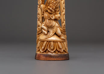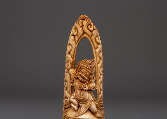 This finely hand-carved Vajrapani Bone statue represents the fierce protector of the Dharma. It is 14.5cm tall and 5.5cm wide, made of ethically sourced yak bone, and has a wooden base. Weighing 0.066kg, this finely sculpted figurine depicts Vajrapani, the powerful defender and embodiment of the Buddha's strength. The sculpture depicts Vajrapani in a dynamic pose with one arm uplifted, indicating his duty as a protector and removing obstacles.