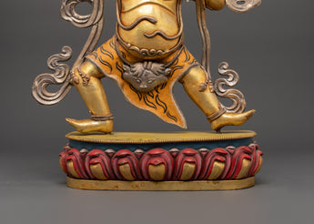 This Vajrapani statue is an excellent work of Tibetan Buddhist art and a spiritual object that adds to any room with its profound meaning and intricate craftsmanship. Using gold plating, silver, and acrylic paint results in a vivid, eye-catching sculpture that is both a potent spiritual tool and a lovely ornamental piece. Whether put on a Buddhist altar, in a meditation room, or as a spiritual focal point in your house, this statue reminds practitioners of Vajrapani's role in protecting and guiding them on their path to enlightenment. Its powerful, protective presence provides aesthetic beauty and a lasting sense of spiritual strength, protection, and knowledge, making it a valuable addition to any religious art collection.