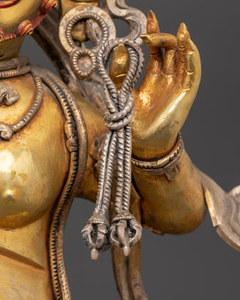 This Handcrafted Vajrapani Statue is a stunning depiction of the Tibetan Buddhist guardian god, precisely crafted with a copper body and gorgeously plated in gold, embellished with pure silver and acrylic paint. This statue, which stands 50.5 cm tall and 36 cm wide, portrays the great spiritual strength of Vajrapani, the defender of the Buddha's teachings. Vajrapani is a strong defender, depicted with a vajra in his left hand, indicating indestructible wisdom, and a rope in his right hand, representing his role in binding and eliminating evil energy. His crown, which contains five exquisitely etched faces with a vajra at the top, reflects his diverse character and authority. He became an enduring icon of spiritual force. In Buddhist beliefs, the lotus moon disc denotes purity, enlightenment, and spiritual awakening. Hence, the deity stands majestically atop it.