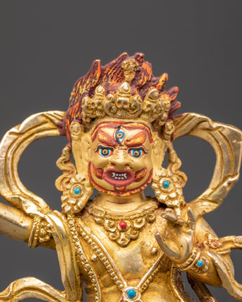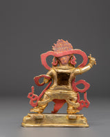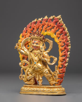 The Meditation Deity Vajrapani stands at 18.5cm in height and 13cm in width, weighing 0.81kg. Crafted from copper and gold-plated for a radiant finish, this powerful deity sculpture represents Vajrapani, the Buddhist protector and deity of strength, compassion, and spiritual protection. Known for his role in safeguarding Buddha's teachings, Vajrapani is often depicted in a fierce and protective stance, symbolizing the removal of obstacles and the nurturing of spiritual enlightenment. With vibrant artificial stones like turquoise and coral embedded into the sculpture, it offers both spiritual and aesthetic value to your altar or meditation space.