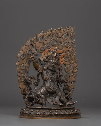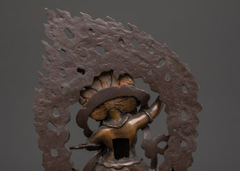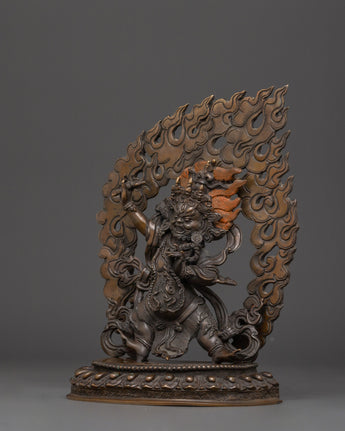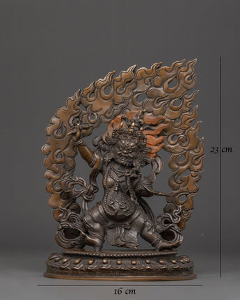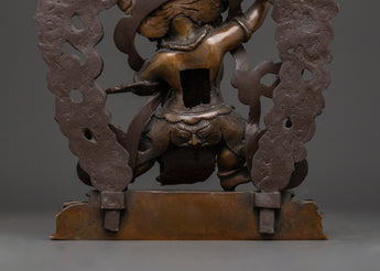 This Vajrapani statue measures 23 cm in height and 16 cm in width, weighing 1.70 kg. It is made of oxidized copper and has rich craftsmanship, including a strong blazing halo that surrounds the god, signifying Vajrapani's ferocious fury and protection. The statue is firmly placed on a lotus base embellished with traditional designs, combining beauty and solidity. Its large size and weight make it a striking focal point for meditation altars or spiritual places.