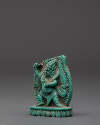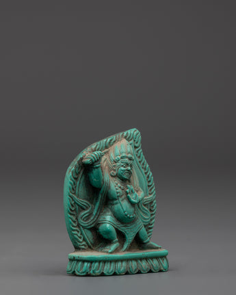 This masterfully carved Vajrapani Buddhist Protector Deity statue stands 6 cm tall and 5 cm wide, weighing 0.032 kg. This statue, crafted from turquoise artificial stone, vividly reflects the strong and dynamic spirit of Vajrapani, a respected guardian god in Tibetan Buddhism. The delicate decorations and brilliant turquoise hue make a spiritual and beautiful addition to any meditation or altar setting.