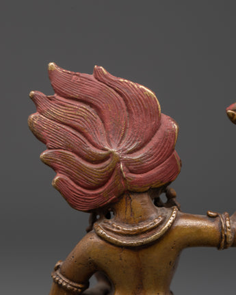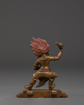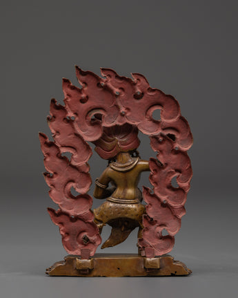 Vajrapani's wrathful representation symbolizes strong compassion and protecting force. In his right hand, he holds a vajra, which represents spiritual resolve and indestructible wisdom. His burning halo represents the transformational force of wisdom, which eliminates ignorance and negative emotions. Vajrapani's ferocious visage, replete with bulging eyes, flaming hair, and dynamic stance, symbolizes his capacity to face challenges and adversity with unwavering compassion.