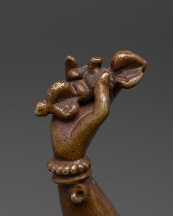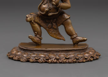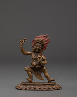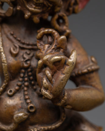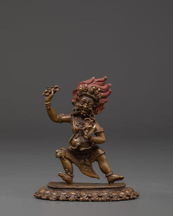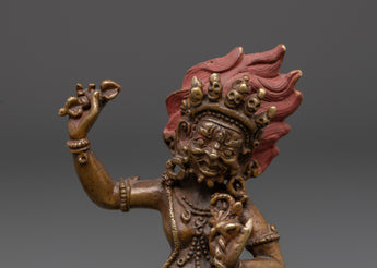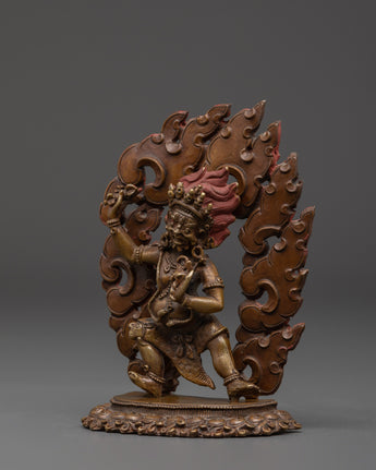 This Vajrapani tibetan buddhist protector deity statue is 14cm in height and 9cm in breadth, and weighs 0.80kg. The statue is skillfully crafted from oxidized copper and captures Vajrapani's significant presence, making it excellent for enhancing spiritual settings, meditation altars, and personal shrines. The copper oxidation process produces a rich, sacred finish that emphasizes intricate details, making it a striking centerpiece for spiritual practice.