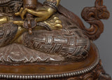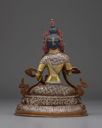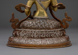 The statue's copper body is adorned with elaborate embellishments, including delicate engravings of sacred mantras, as well as a lotus pedestal that symbolizes spiritual purity and the flowering of enlightenment. The copper tones lend an antique feel to this Tibetan Vajrasattva statue, emphasizing its majesty and wisdom. This statue is not only a magnificent work of art, but also a spiritual tool—ideal for meditation spaces, home altars, or shrines—that provides the benefits of purification and inner calm.