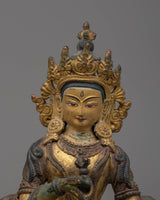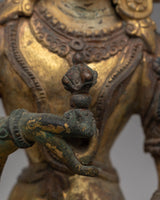 The Copper Vajrasattva Sacred Statue is an intricately crafted representation of Vajrasattva, a revered deity in Tibetan Buddhism symbolizing purification and the removal of obstacles. Standing at 16cm in height and weighing 0.8kg, this statue is made of copper, enhanced with 24K gold plating for a radiant finish. The antique finish gives the statue a timeless, sacred look, while acrylic colors highlight the fine details of Vajrasattva’s serene expression and dynamic posture. The statue serves as a powerful tool for meditation, prayer, and purification rituals, fostering a deeper connection to spiritual growth and inner peace.