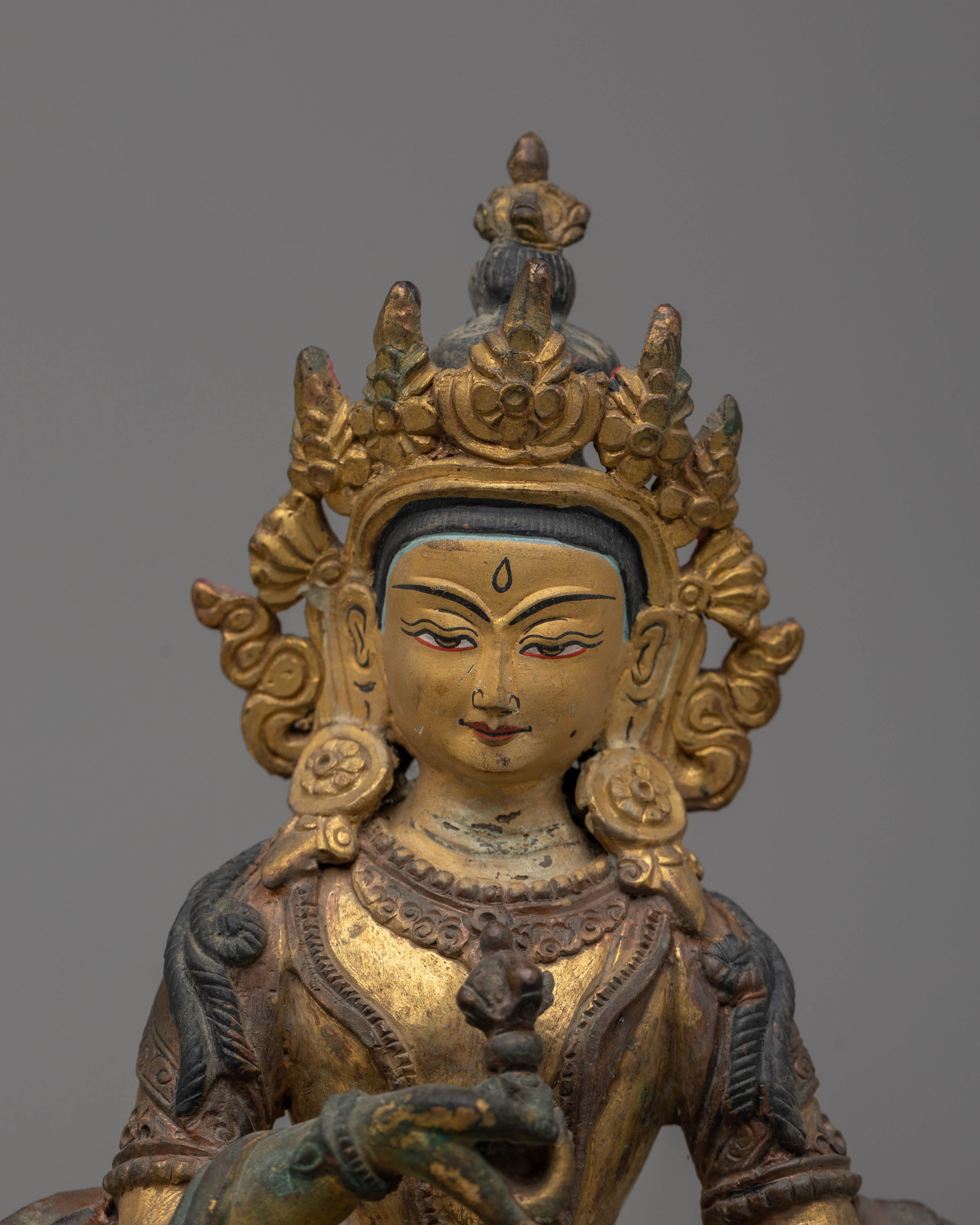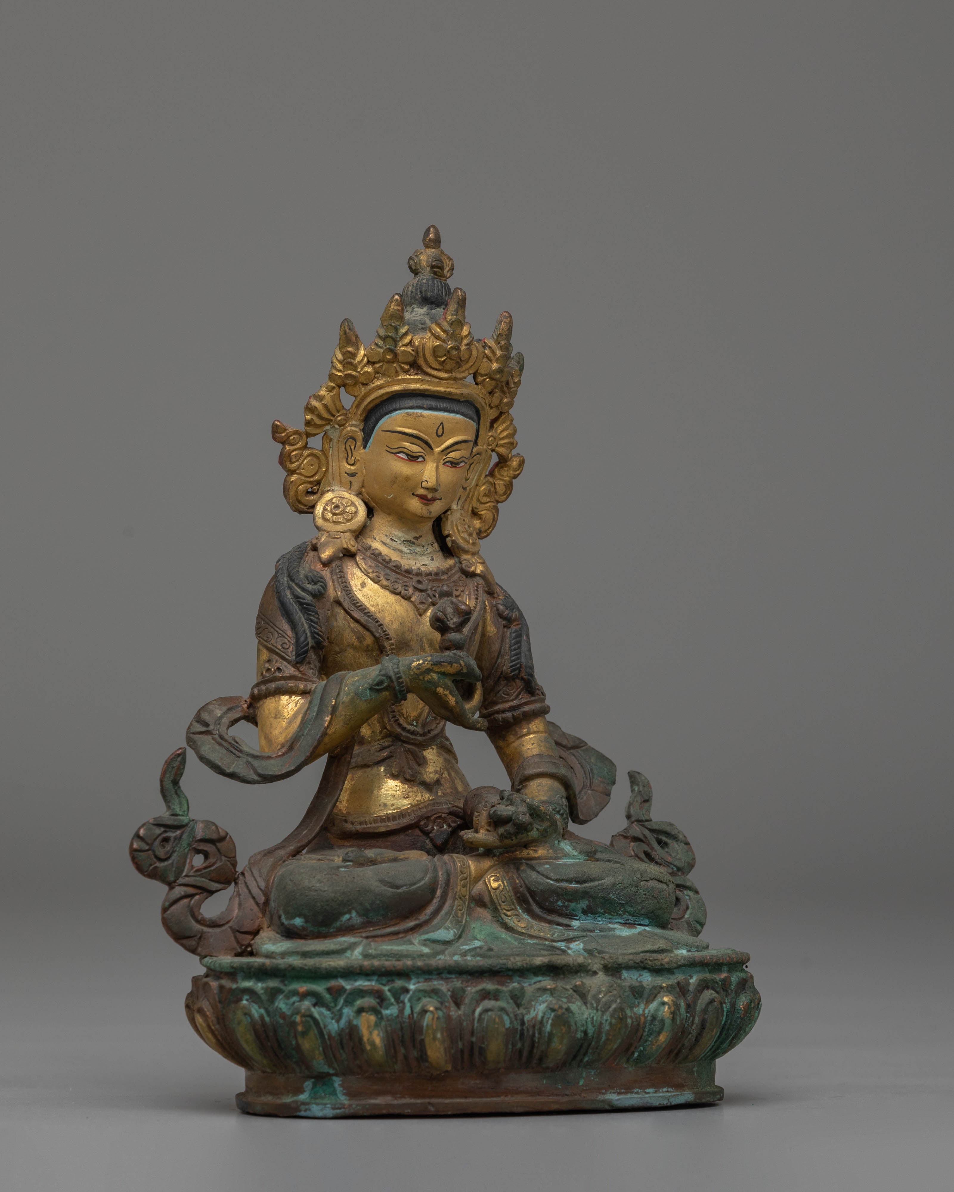 The design of the Vajrasattva statue features intricate details of the deity’s appearance, including his posture, hand gestures, and the symbolic implements he holds, representing the union of wisdom and compassion. The 24K gold plating reflects Vajrasattva’s sacred nature, and the antique finish evokes tradition and reverence. The acrylic colors add vibrancy and depth, accentuating the figure's spiritual significance and making it visually striking. This statue embodies Vajrasattva’s role as the purifier of the mind and spirit, allowing practitioners to connect with his energy during meditation.
