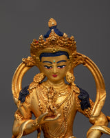 This Divine Vajrasattva Statue with vajra is a magnificent gold-plated copper sculpture of the mighty Tibetan Buddha deity in a tranquil and healing stance. Vajrasattva is depicted holding a vajra and a bell, which represent the unification of wisdom and compassion. This statue, seated on a lotus and wearing a regal crown, embodies purification and spiritual enlightenment. Standing 9.5cm tall and 7.5cm wide, it is the ideal size for a spiritual altar or meditation place, emitting serenity and positive energy.