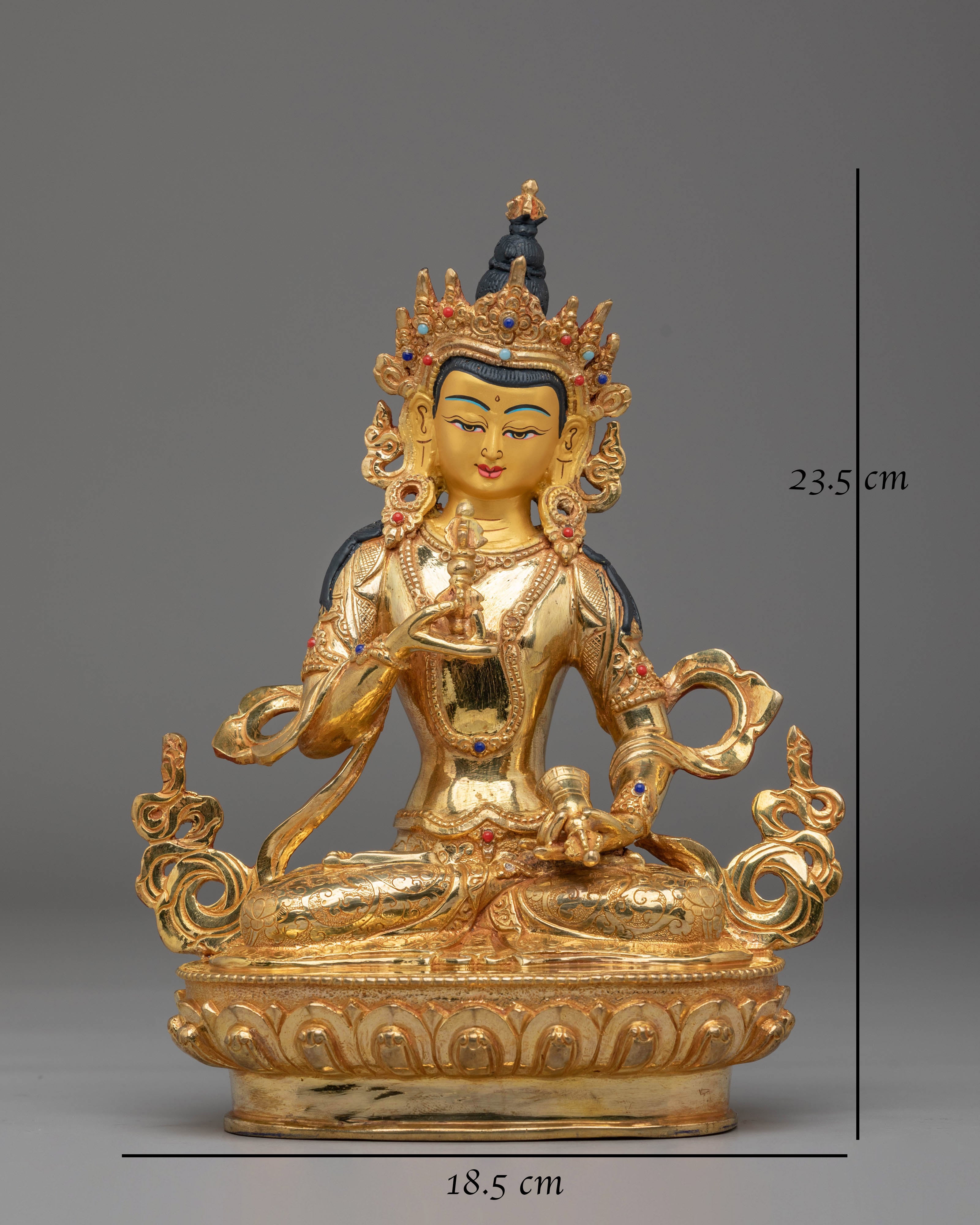 This Gold Plated Dorje Sempa Statue represents the deep spiritual significance of Dorje Sempa, known as Vajrasattva, in Vajrayana Buddhism. Revered as the embodiment of purity and awakened awareness, Dorje Sempa is associated with the cleansing of negative karma and the restoration of inner clarity. Handcrafted from a copper body, adorned with 24K gold plating, acrylic color, and carefully set gemstones, the statue reflects refined Himalayan sacred artistry. Measuring 23.5 cm in height and 18.5 cm in width, with a weight of 1.51 kg, it holds a strong and dignified presence.