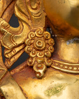 This statue's handmade features highlight Vajrasattva's peaceful look and royal posture, which is enhanced by exquisite embellishments and a lotus base. The gold-plated copper surface emanates an enchanting aura, making it great for altars, meditation places, or as a special spiritual present. Whether utilized for daily meditation or as a beautiful addition to your holy space, this statue exudes profound peace and spiritual connection.