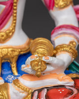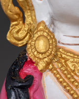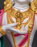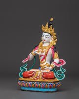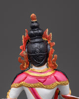Vajrasattva represents purification in Vajrayana Buddhism, assisting practitioners in removing negativity and accumulating merit. His serene position promotes balance and clarity, with the right hand holding the vajra at heart level and the left cradling the bell. Captivating acrylic colors highlight his robes, crown, and tools, while the polished copper surface shines through, adding depth and brilliance to the sculpture.