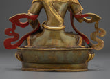 This statue of Vajrayogini is a stunning depiction of the Tibetan deity of wisdom, power, and transformation. This masterfully created statue stands 37.5cm tall, with a base of 26.5cm, and weighs 3.84kg. It is constructed of oxidized copper with gold-plated highlights, which enhance the deity's holy presence. Vajrayogini is represented in a dynamic, dance-like pose, clutching a vajra (thunderbolt) and a skull cup, which represent her capacity to demolish ignorance and transcend spiritual impediments. Her fierce look and commanding presence emanate strength, while the rich decorations on her dress, jewels, and the flowing flames around her symbolize her power and wisdom.