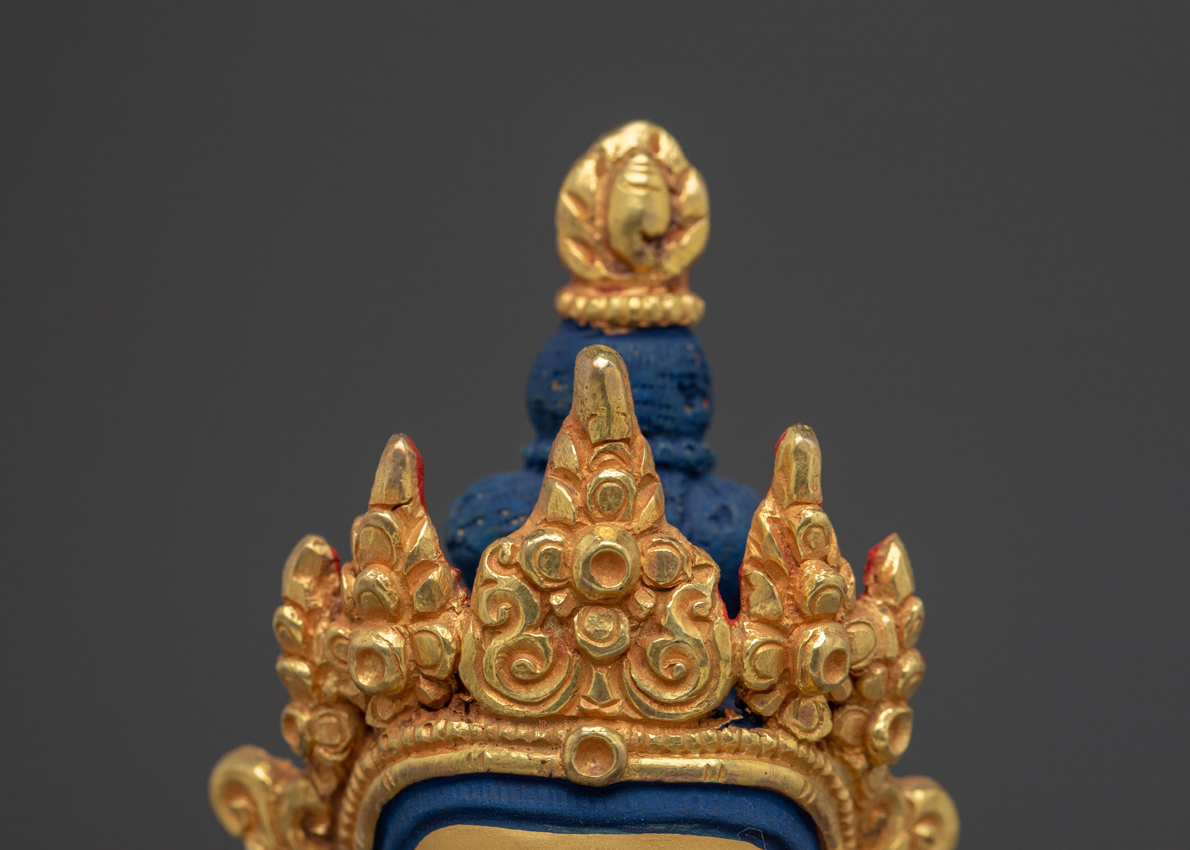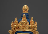 The statue's gold-plated copper body showcases its intricate craftsmanship. The flaming orange and red flames that surround Vajrayogini's body represent her transforming power—burning away ignorance and fear to unveil enlightened understanding. The beautiful lotus pedestal below her represents purity and spiritual uplift. This Vajrayogini statue serves as a powerful reminder of the goddess's transformational powers and her role as a protector and guide on the path to enlightenment. It makes a meaningful and powerful addition to meditation rooms, shrines, and altars.