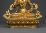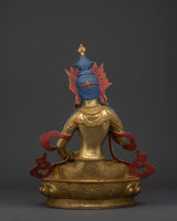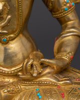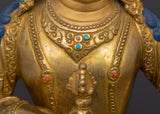 Exquisite workmanship highlights Vajrasattva's calm demeanor and ceremonial tools in this statue of him sitting on a lotus throne. His presence encourages enlightenment, inner tranquility, and spiritual clarity. The statue's spiritual aura is enhanced by the thoughtfully positioned coral and turquoise stones, which showcase Tibetan commitment and skill. This statue is ideal for collectors of genuine Buddhist art or practitioners looking to enhance their purifying rituals.